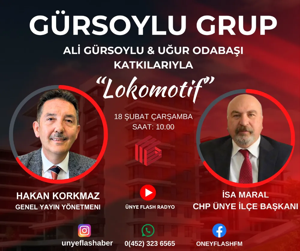 Gürsoylu Grup Ali Gürsoylu & Uğur Odabaşı katkılarıyla hazırlanan “Lokomotif” programının bu haftaki stüdyo konuğu, CHP Ünye İlçe Başkanı İsa Maral olacak.