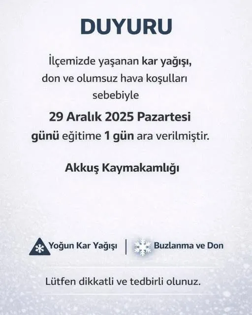 Akkuş Kaymakamlığı’ndan yapılan açıklamada, “İlçemizde yaşanan kar yağışı, don ve olumsuz hava koşulları sebebiyle 29 Aralık 2025 Pazartesi günü eğitime bir gün ara verilmiştir.” denildi.