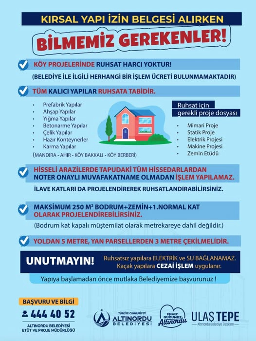 Altınordu Belediyesi, kırsal alanlarda inşa edilecek tüm kalıcı yapıların ruhsata tabi olduğunu hatırlatarak vatandaşlara önemli uyarılarda bulundu. Belediyeden yapılan açıklamada, kaçak ve ruhsatsız yapılaşmaya kesinlikle müsamaha gösterilmeyeceği vurgulandı.