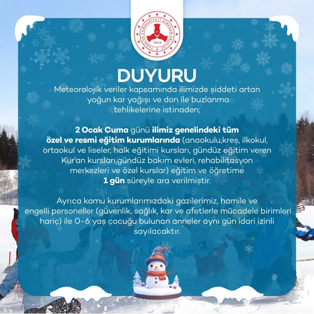 Giresun Valisi Sayın Mehmet Fatih Serdengeçti, il genelinde etkisini artıran yoğun kar yağışı nedeniyle 2 Ocak 2026 Cuma günü tüm resmi ve özel eğitim kurumlarında eğitim ve öğretime 1 (bir) gün süreyle ara verildiğini açıkladı.
