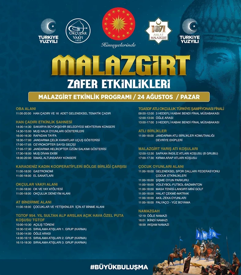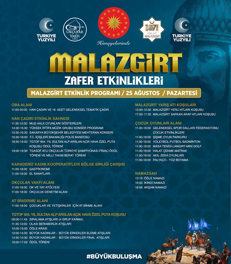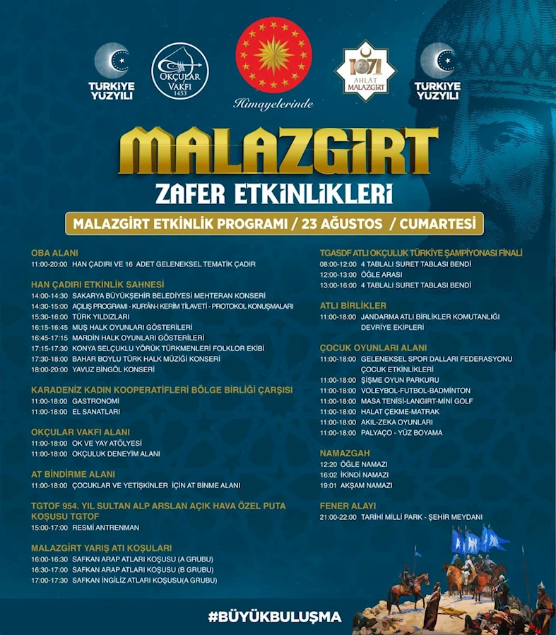 Yetkililerden yapılan açıklamada, “Malazgirt Zaferi, milletimizin Anadolu’daki varlığının temeli ve geleceğe uzanan yolun başlangıcıdır. Bu anlamlı günün yıl dönümünde tüm vatandaşlarımızı etkinliklerimize davet ediyoruz.” ifadelerine yer verildi.