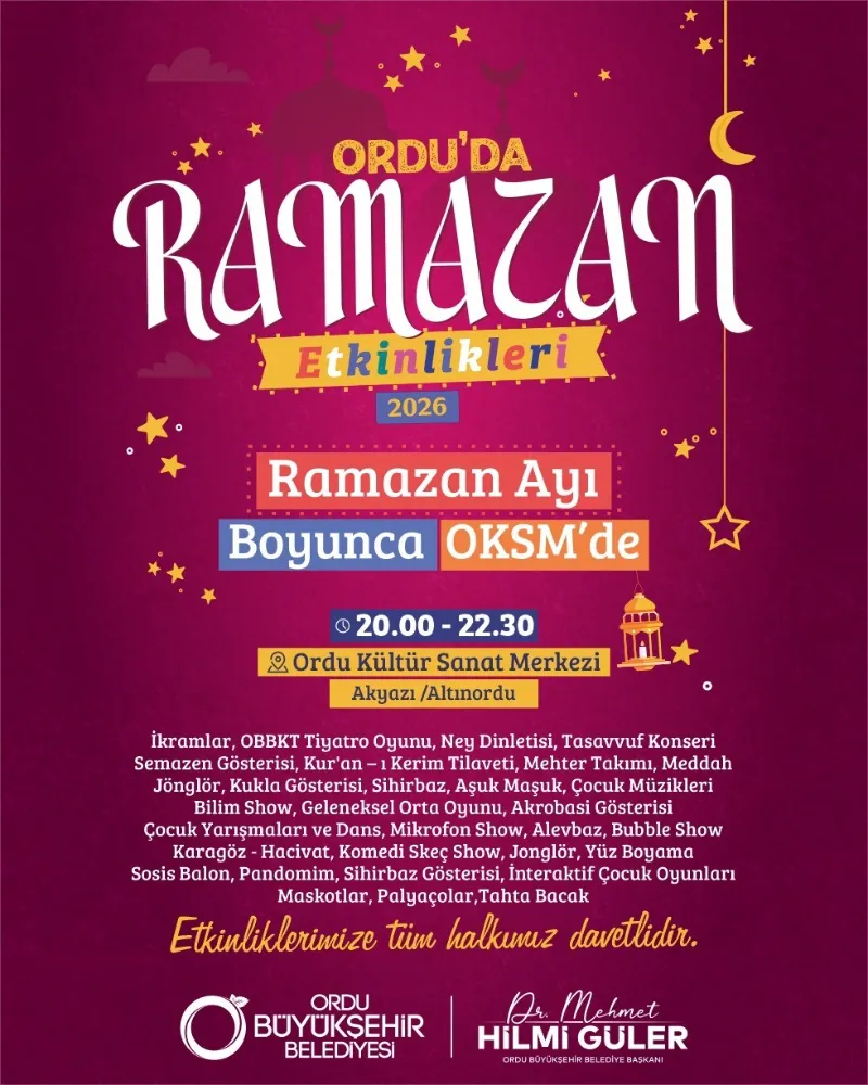 Ordu Büyükşehir Belediyesi, düzenleyeceği iftar programları ve kültür-sanat etkinlikleriyle Ramazan’ın yardımlaşma ve dayanışma ruhunu 19 ilçeye yayacak. Çocuklar ve ailelere yönelik hazırlanan kapsamlı programlarla şehir genelinde unutulmaz bir Ramazan atmosferi oluşturulacak.