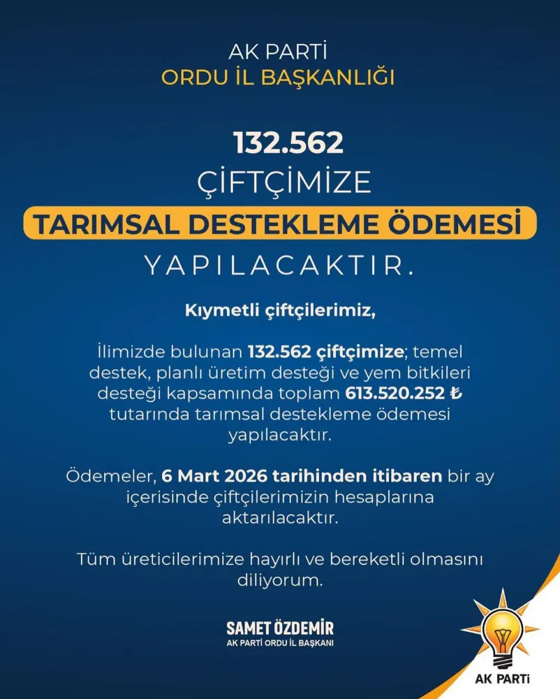 Özdemir yaptığı paylaşımda, il genelinde bulunan 132 bin 562 çiftçiye; temel destek, planlı üretim desteği ve yem bitkileri desteği kapsamında ödeme gerçekleştirileceğini belirtti.