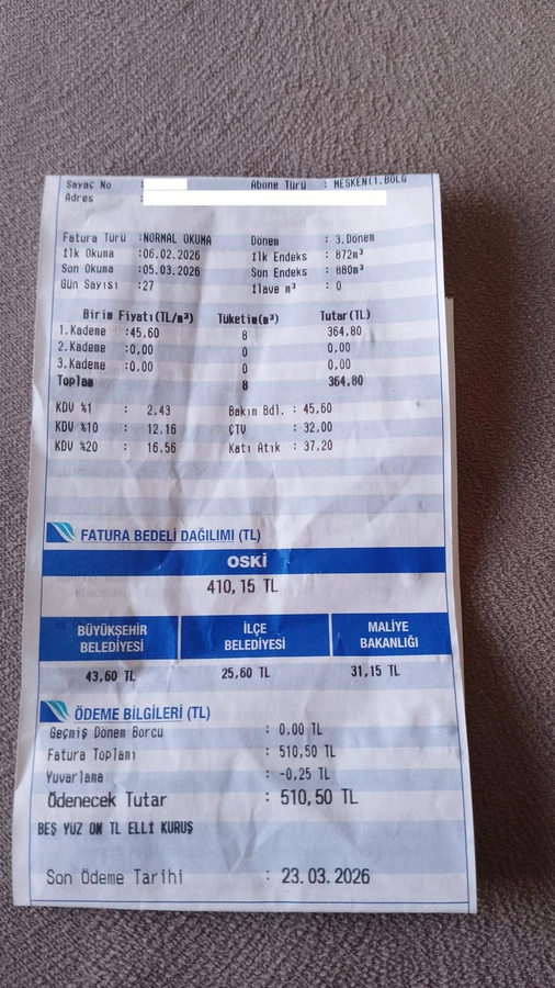 OSKİ'ye ait 2 Mart 2026 tarihli bir faturada 8 metreküp su kullanan bir vatandaş 510 TL ödemiştir.