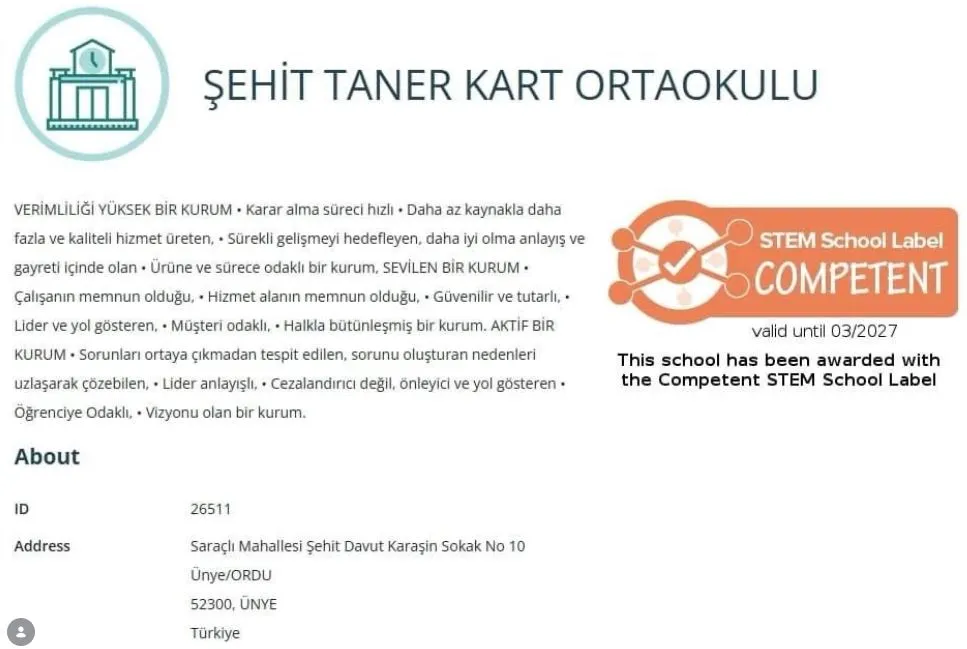 Bu kapsamda Ünye Şehit Taner Kart Ortaokulu’nda gerçekleştirilen STEM temelli çalışmalar; bilimsel düşünceyi merkeze alan, problem çözme becerilerini geliştiren ve üretkenliği teşvik eden uygulamalarıyla dikkat çekti. Yapılan değerlendirmeler sonucunda okul, uluslararası ölçekte “Yetkin STEM Okulu” unvanını almaya layık görüldü.