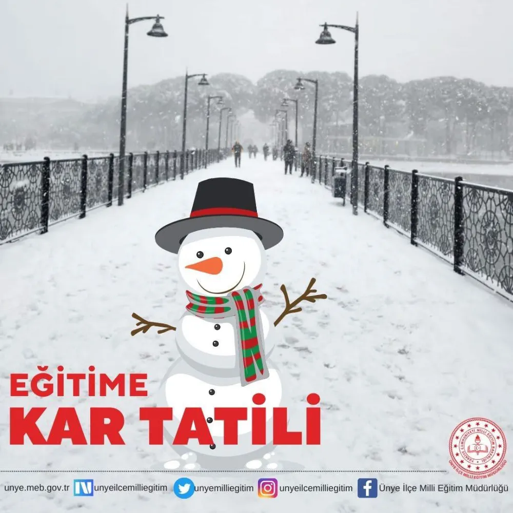 Ünye’de etkisini sürdüren yoğun kar yağışı ve olumsuz hava koşulları nedeniyle bazı okullarda 27 Şubat 2026 Cuma günü eğitim-öğretime 1 (bir) gün süreyle ara verildi.