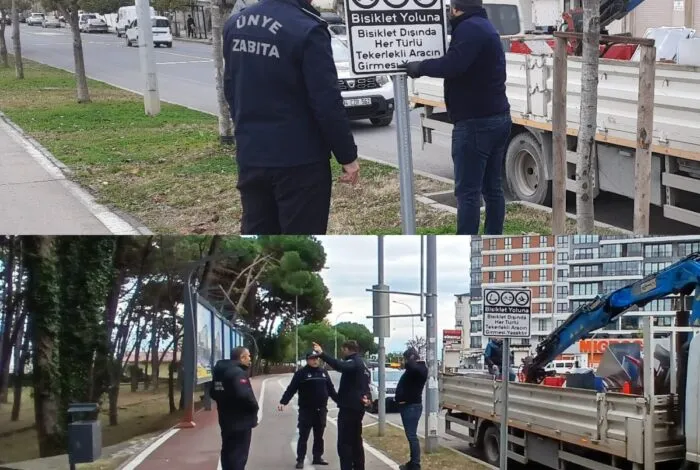 Ünye Belediyesi Zabıta Müdürlüğü ekipleri tarafından yaya yolu ve bisiklet yoluna uyarı levhaları konuldu.