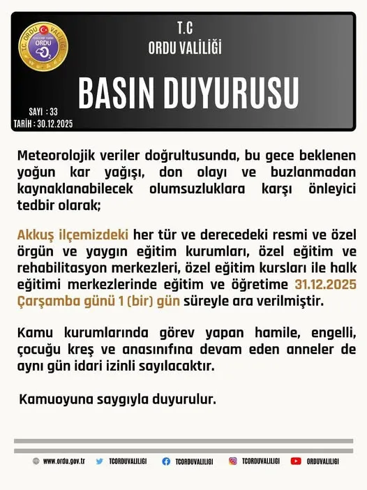 Alınan karar doğrultusunda, Akkuş ilçesinde her tür ve derecedeki resmi ve özel örgün ve yaygın eğitim kurumları, özel eğitim ve rehabilitasyon merkezleri, özel eğitim kursları ile halk eğitimi merkezlerinde eğitim ve öğretim faaliyetleri 31 Aralık 2025 Çarşamba günü yapılmayacak.