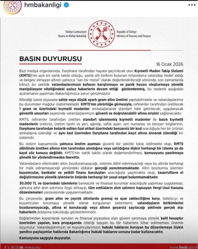 Medya organlarında ve bazı sosyal medya hesaplarında, Darphane tarafından hayata geçirilecek olan Kıymetli Maden Takip Sistemi (KMTS) hakkında kamuoyunu yanıltmaya yönelik asılsız iddiaların dolaşıma sokulduğu belirtilerek, konuya ilişkin Hazine ve Maliye Bakanlığı tarafından açıklama yapılmasının zaruri görüldüğü bildirildi.