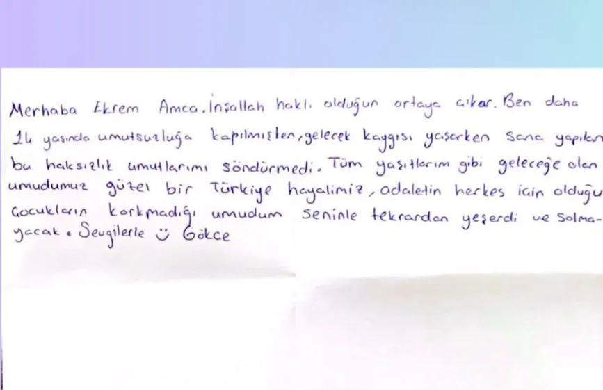 Mektubunda, "İnşallah haklı olduğun ortaya çıkar. Ben daha 14 yaşındayken umutsuzluğa kapıldım, gelecek kaygısı yaşadım. Ancak sana yapılan bu haksızlık, umutlarımı söndürmedi," diyen Gökçe, tüm yaşıtlarıyla birlikte güzel bir Türkiye hayali kurduğunu ve adaletin herkes için olması gerektiğini vurguladı. Genç kız, mektubunda Ekrem İmamoğlu'nun mücadelesiyle yeniden umut bulduğunu belirtti.