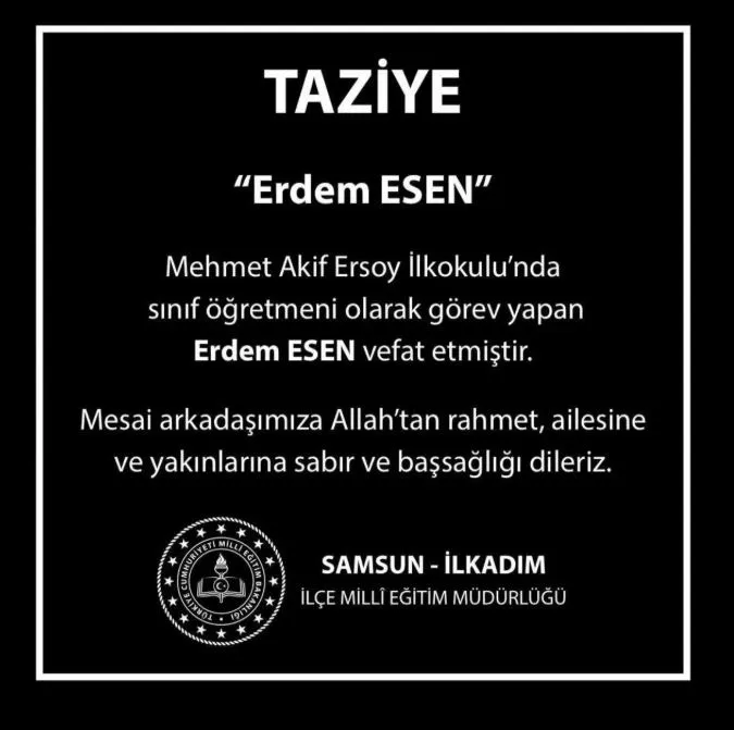 Samsun'un İlkadım ilçesinde üzücü bir olay meydana geldi. Mehmet Akif Ersoy İlkokulu'nda görev yapan sınıf öğretmeni Erdem Esen, geçirdiği kalp krizi sonucu hayatını kaybetti.