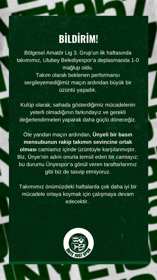 Maçın ardından Kulüp, Ünyeli bir basın mensubunun rakip takımın sevincine ortak olmasına tepki gösterdi. Açıklamada, “Biz Ünye’nin adını onurla temsil eden bir camiayız. Bu durumu Ünyespor’a gönül veren taraftarlarımız gibi biz de tasvip etmiyoruz.” denildi.
