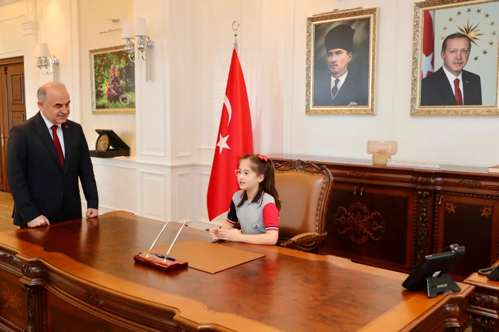 Vali koltuğuna oturan temsili Vali Elif Alya Dikmen, tüm çocukların 23 Nisan Ulusal Egemenlik ve Çocuk Bayramını kutlayarak, “Mustafa Kemal Atatürk biz çocuklara 23 Nisan’ı armağan etti. Dünyada çocuklara armağan edilen tek bayram olan bugünümüzde çok mutluyuz.” dedi.